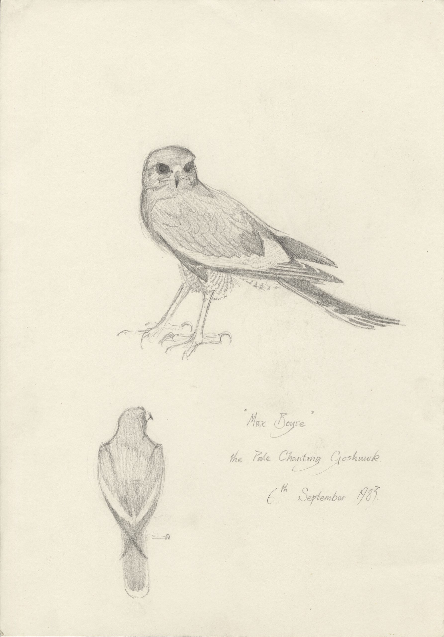 A Pale Chanting Goshawk and a great singer of songs. Max came to me with paralysed feet. After a couple of weeks plodding around my stoop on some wooden clogs that I made for him he fully recovered the use of his taloned toes and could be released on Biesjiesfontein.
